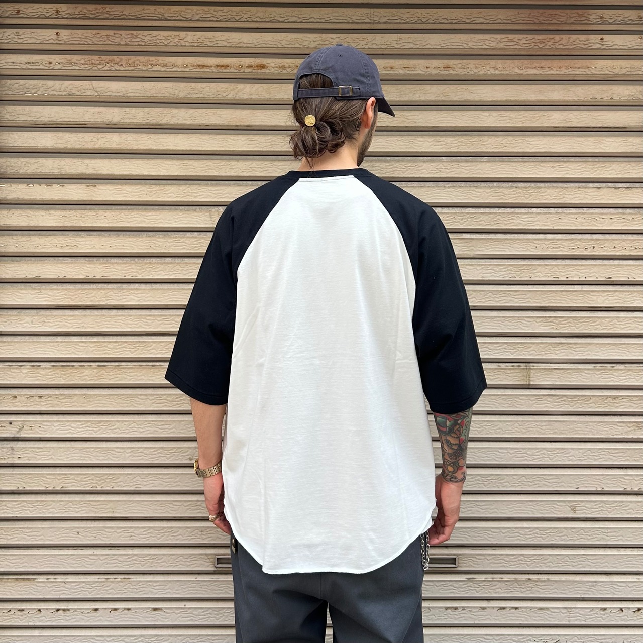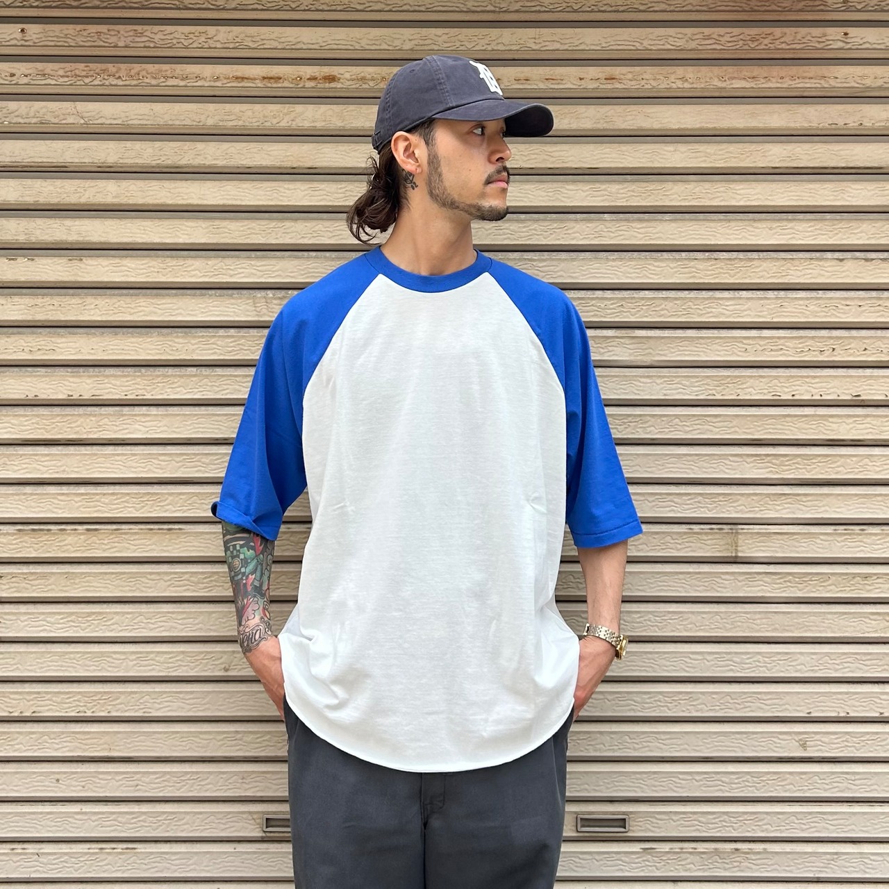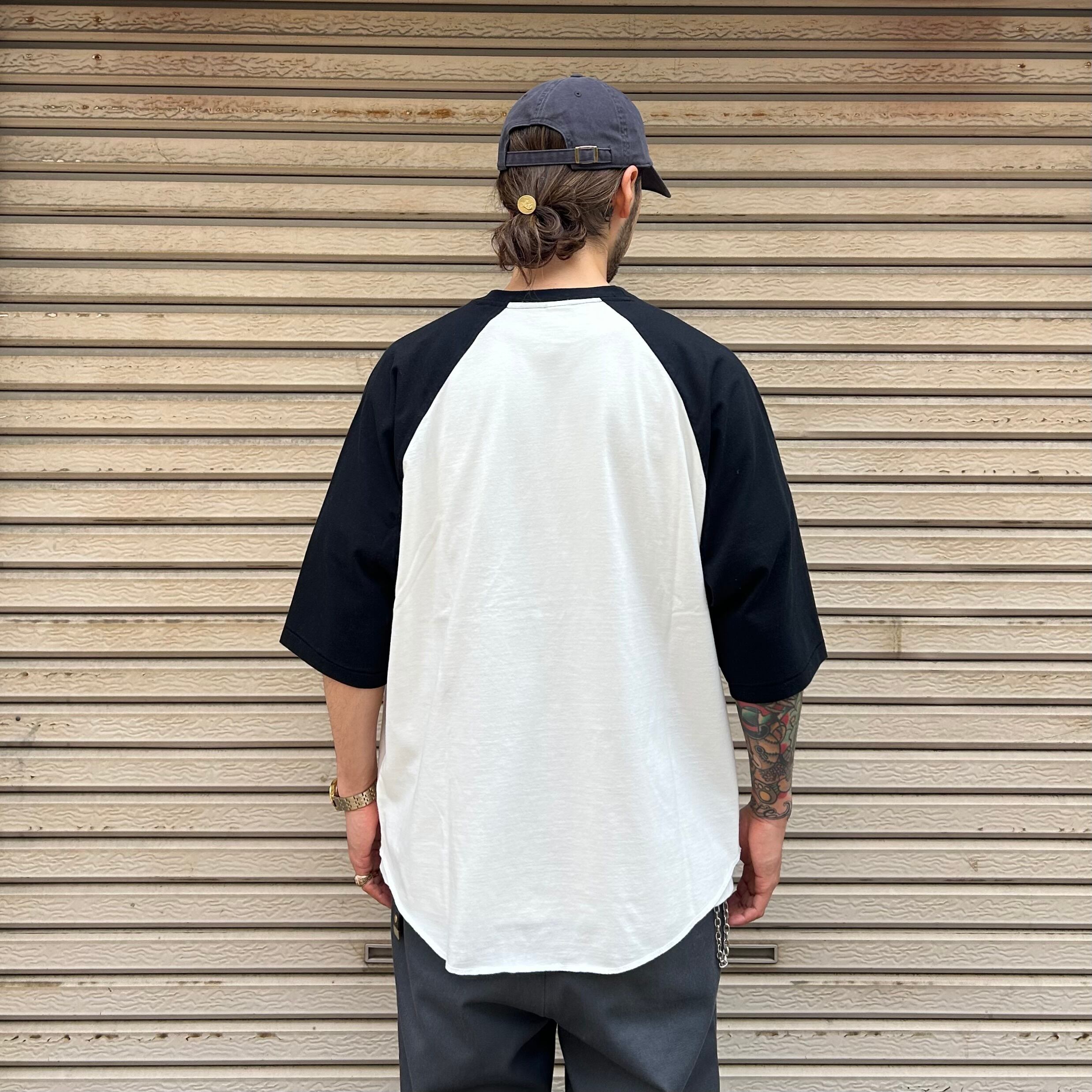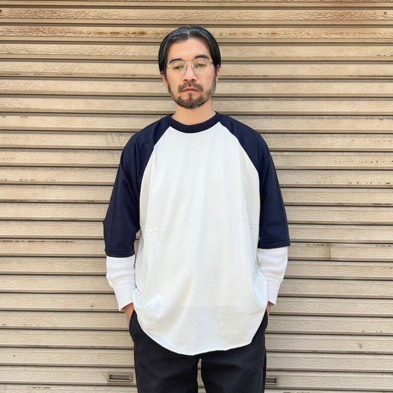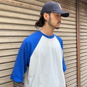 古着のラグランTシャツと同様に綿50%/ポリエステル50%の生地を使用しヴィンテージ感を演出。