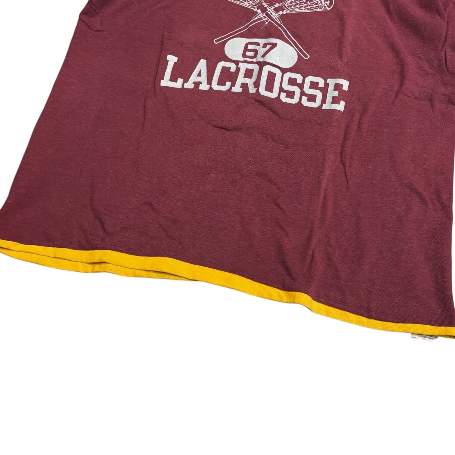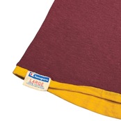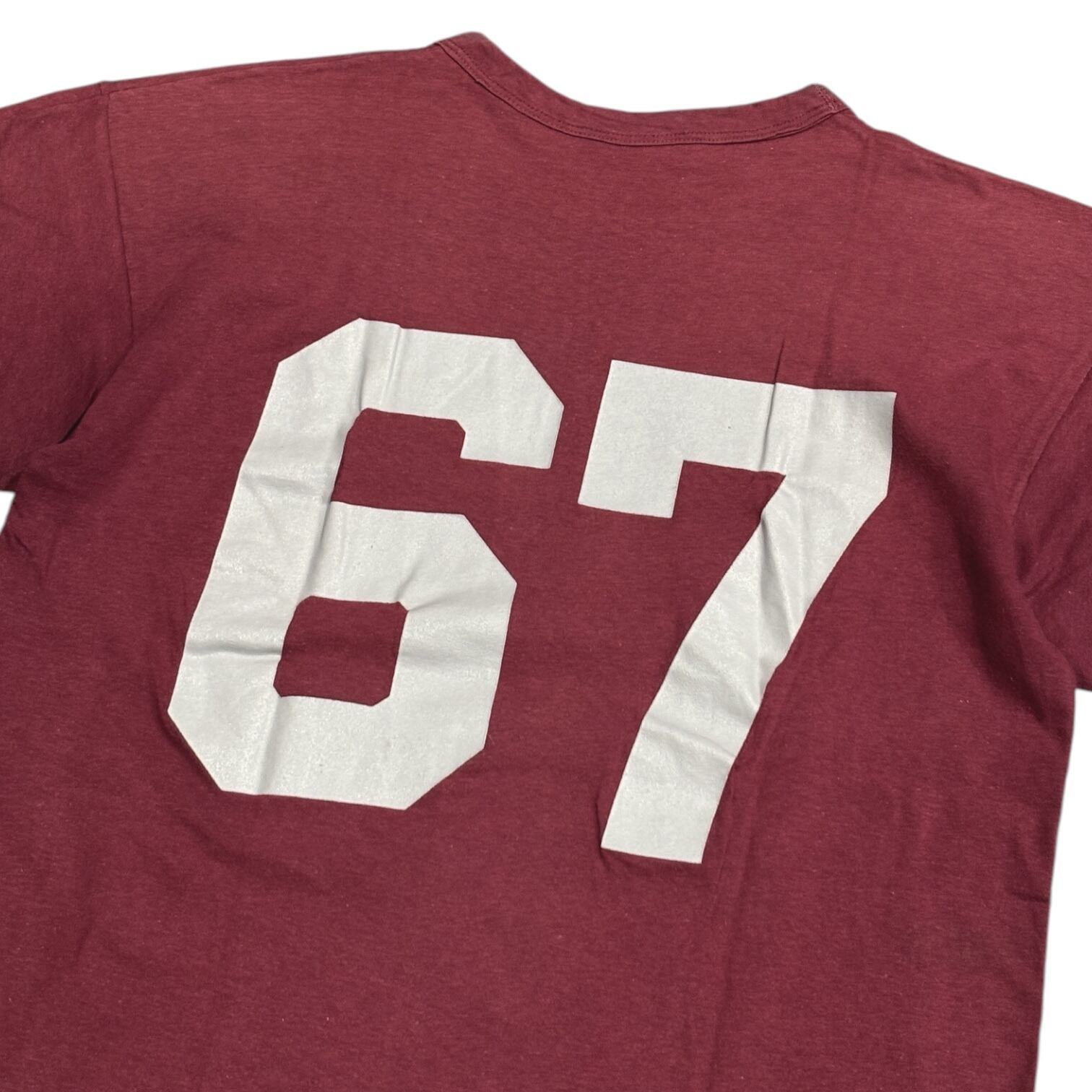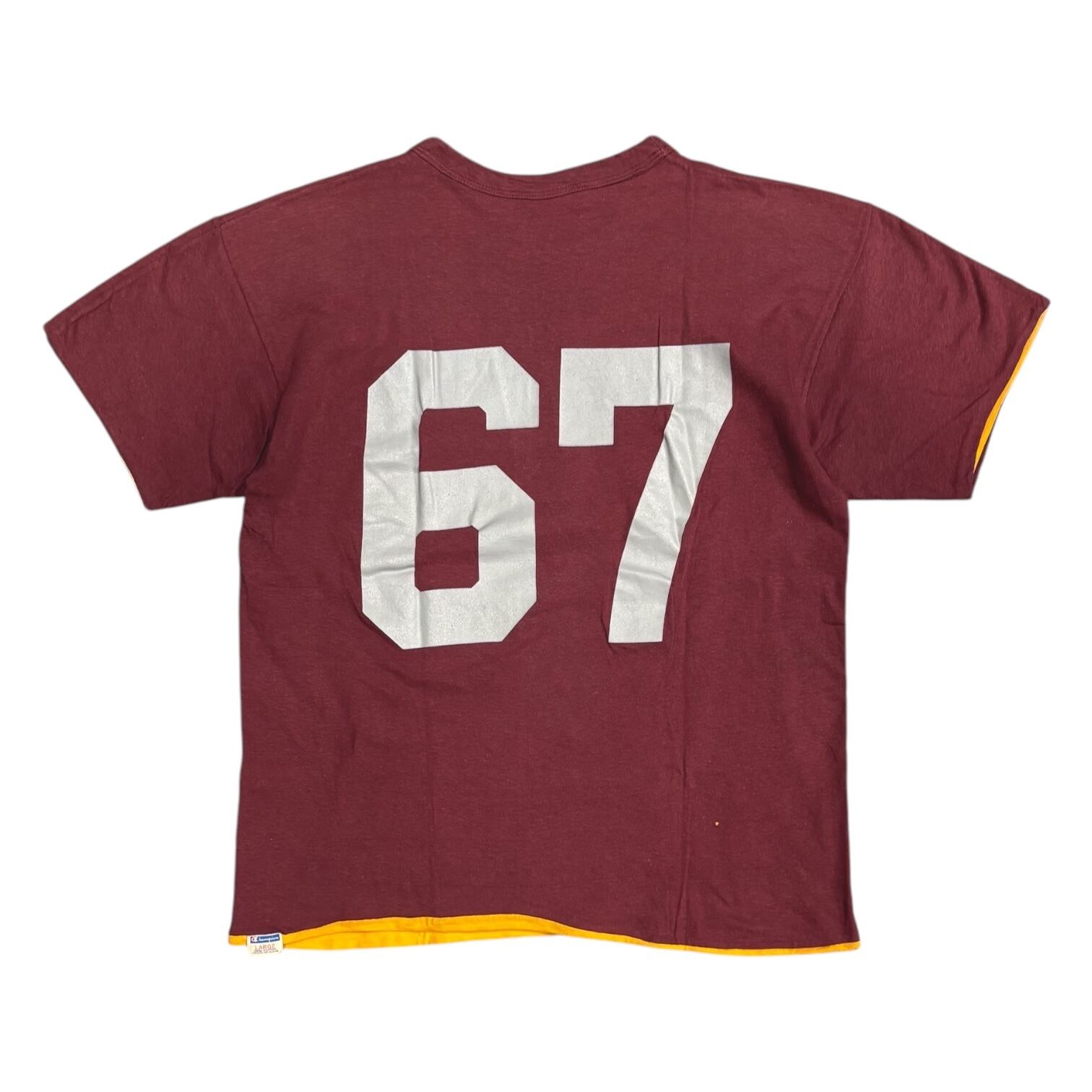 リバーシブル仕様で、A面がバーガンディボディーに、フロントにグレーのラバープリントで4段のカレッジプリント、バックに67のナンバリング、B面がイエローの無地です。