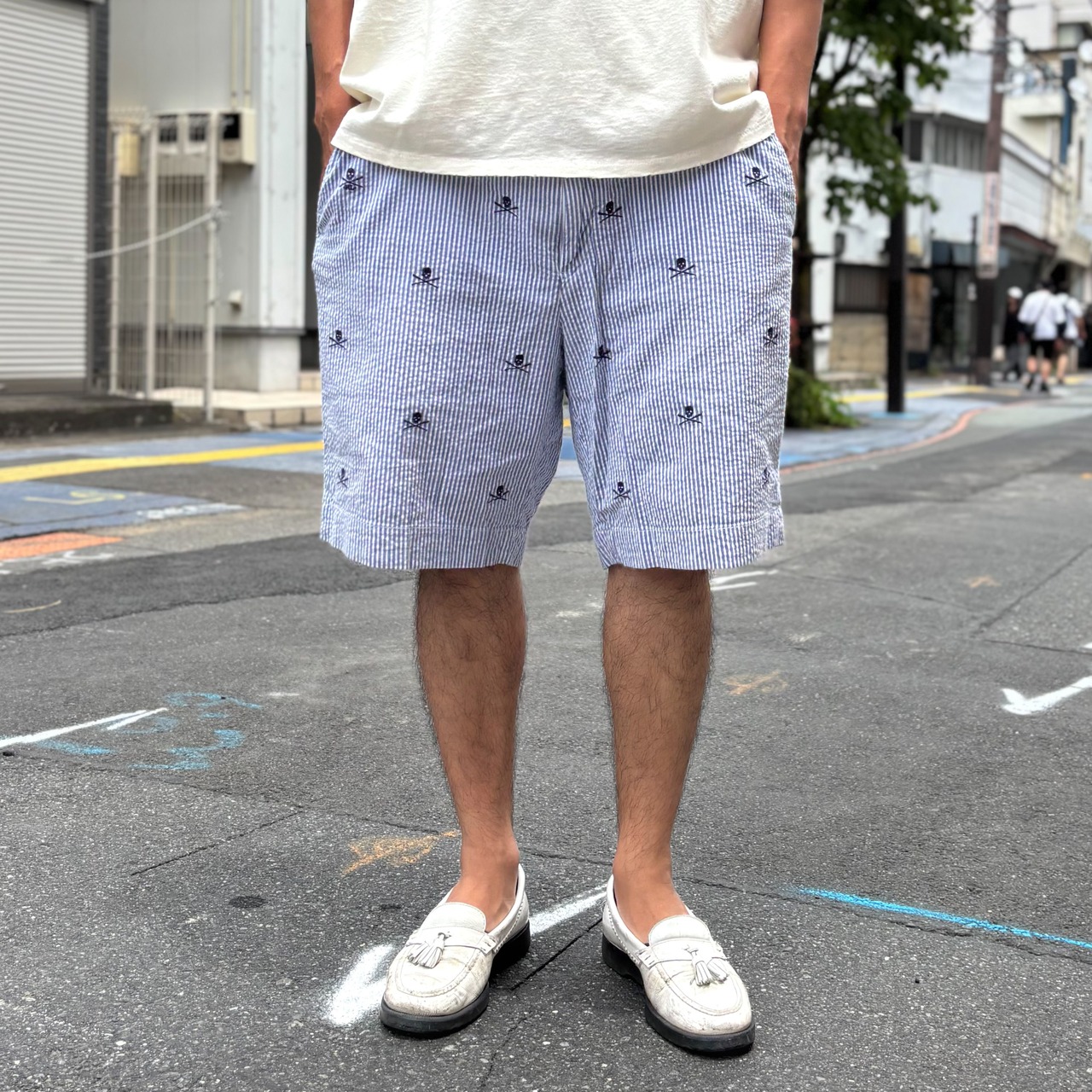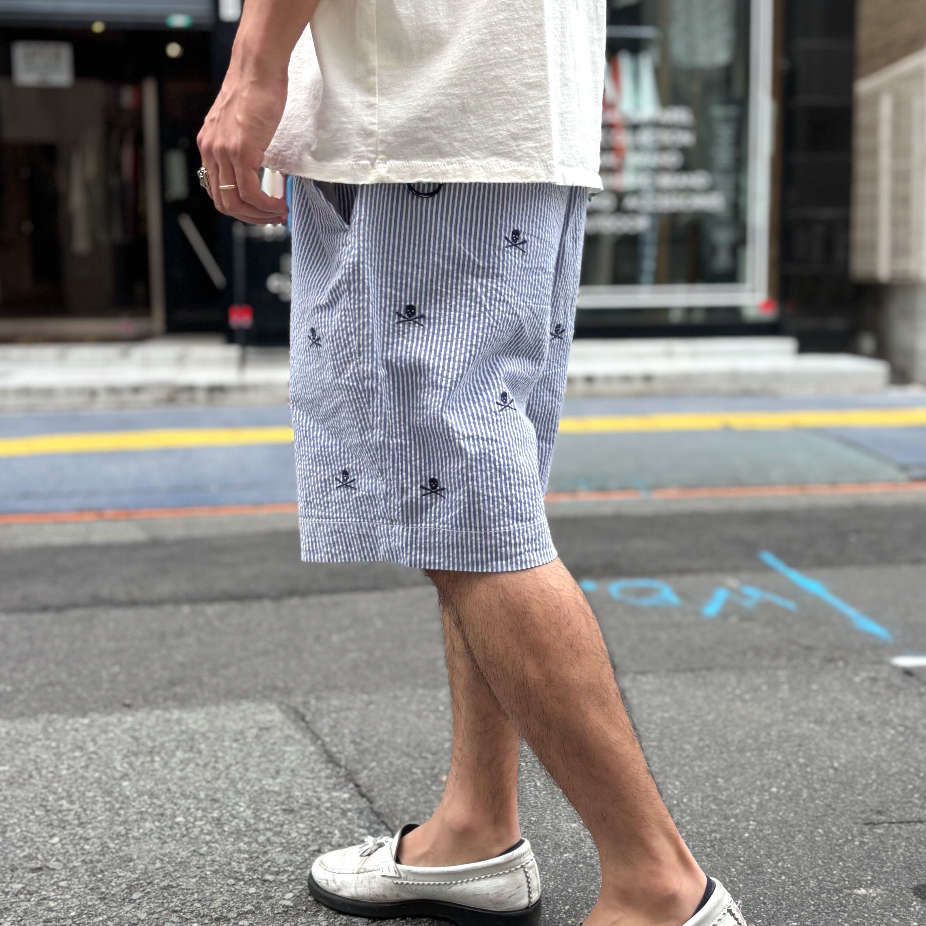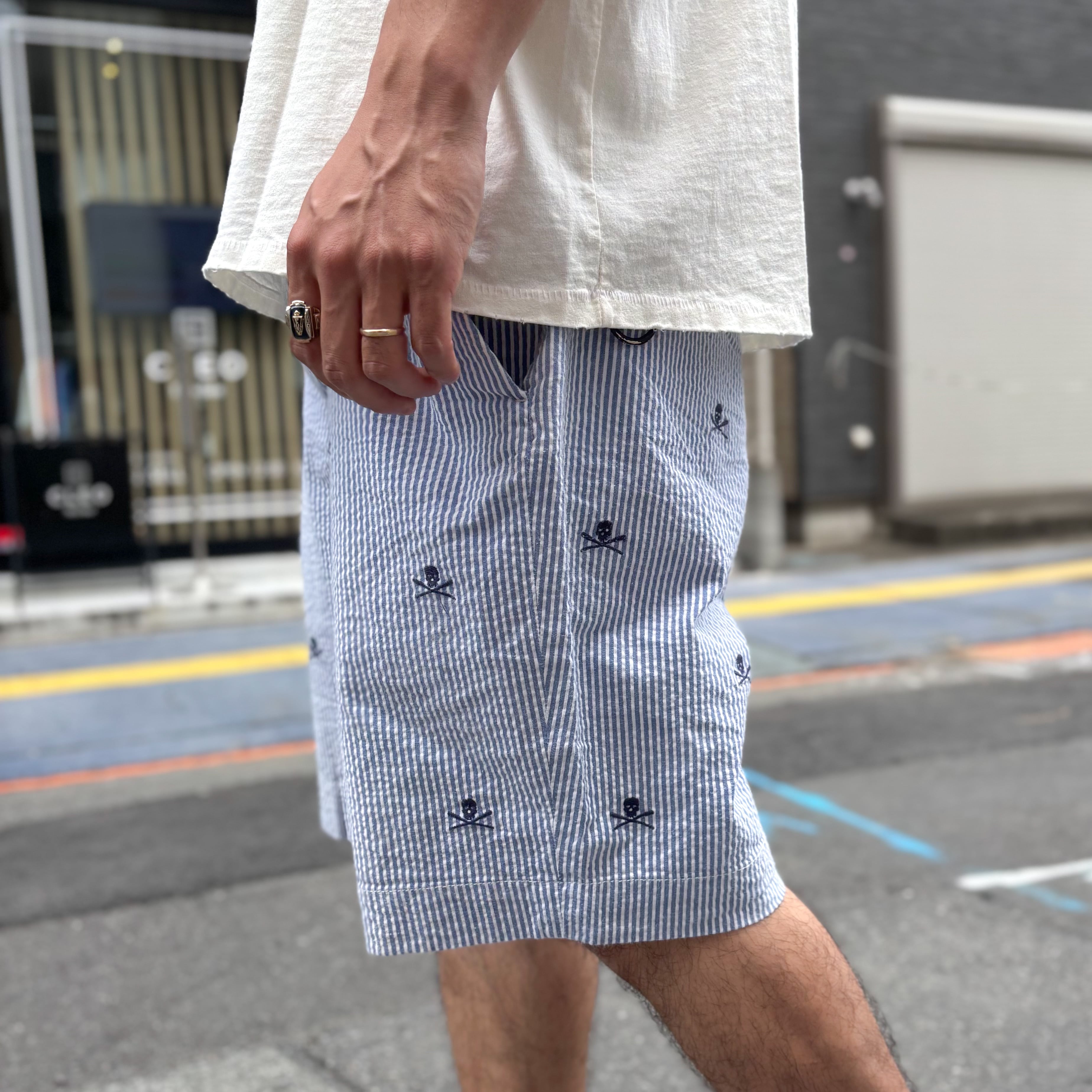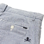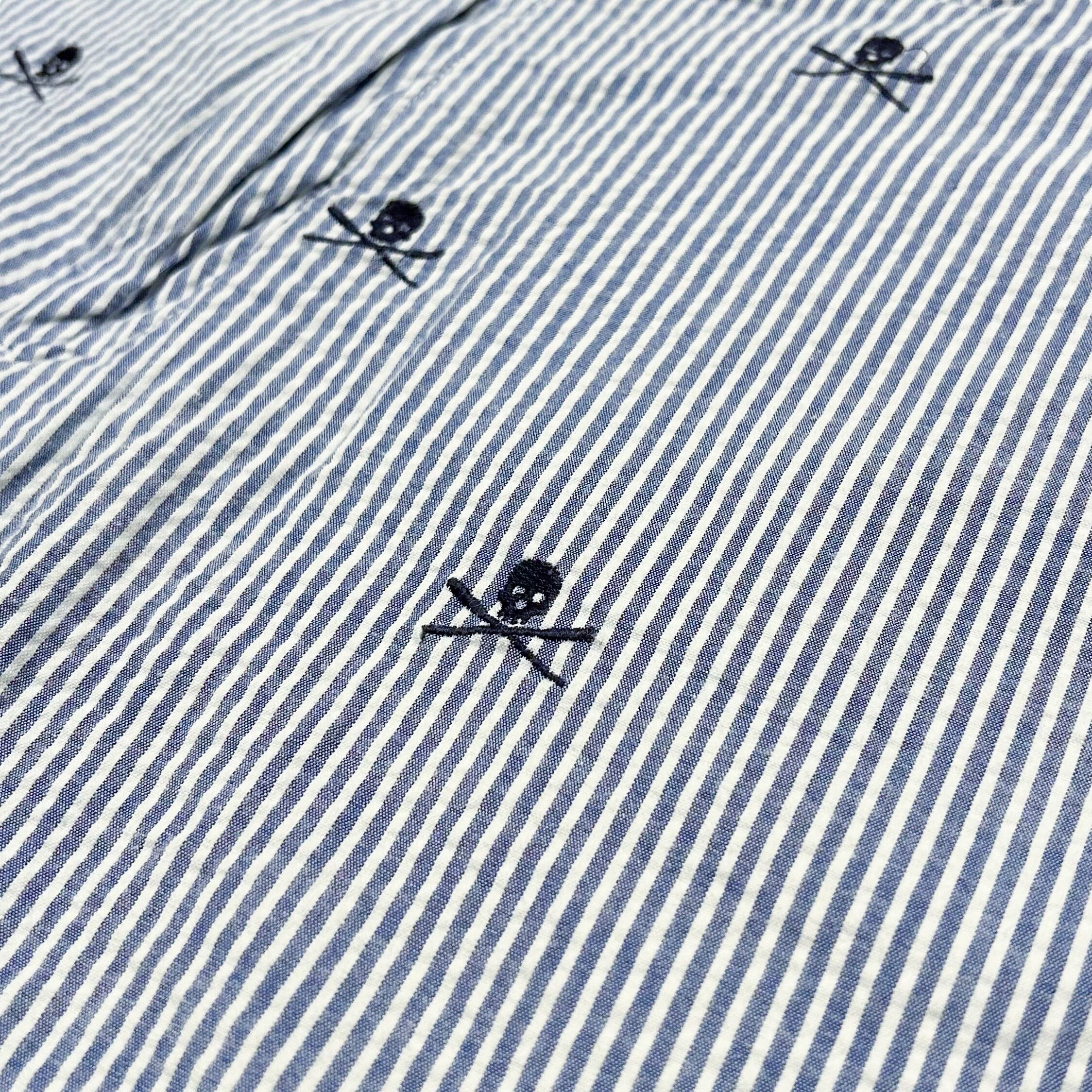 ブルー×ホワイトのストライプ柄のシアサッカー生地にスカルの刺繍が総柄で施されています。