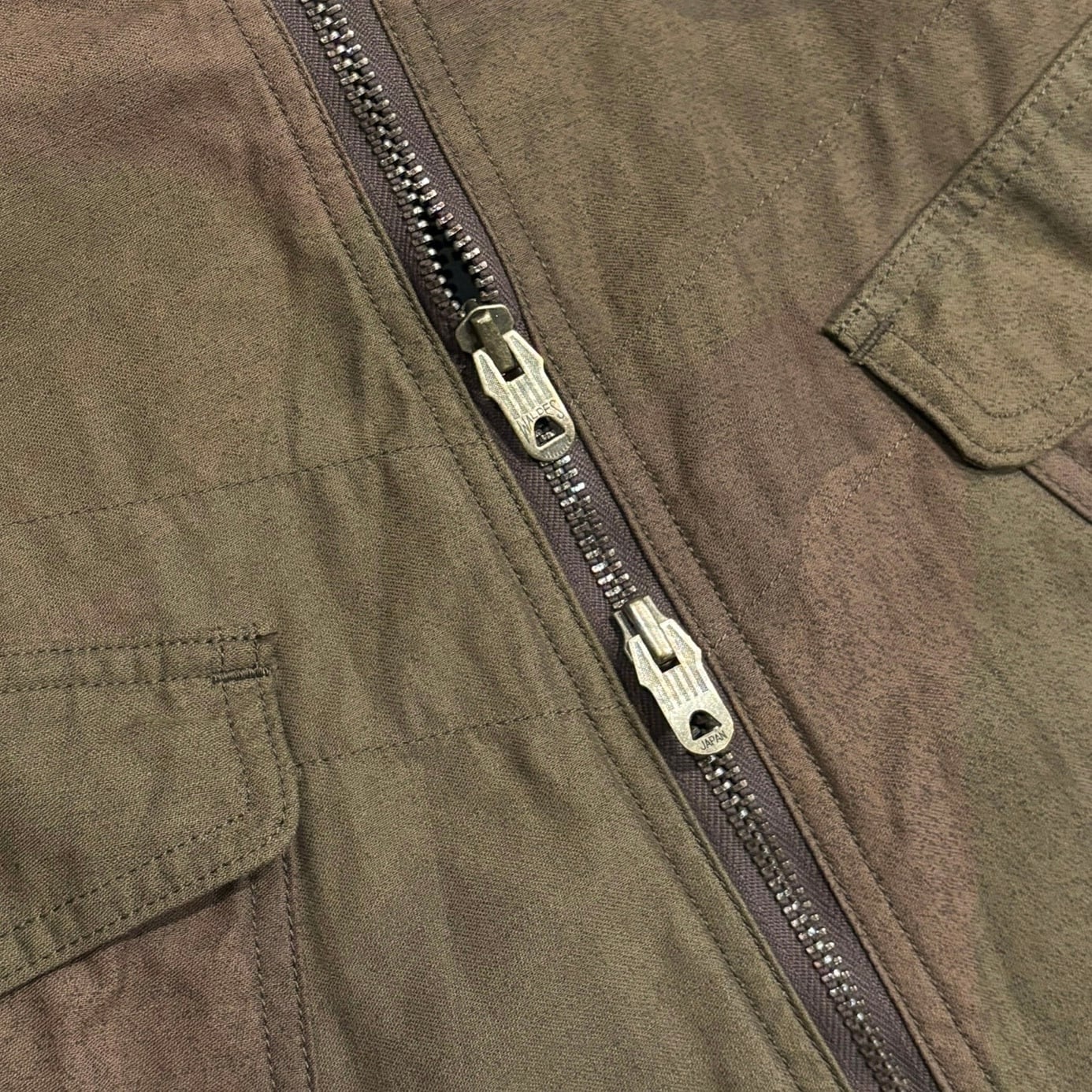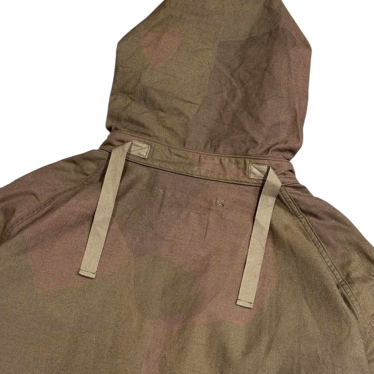 英国特殊空挺部隊「S.A.S.」が使用していた迷彩柄を採用し、パターンごとに染料と顔料を使い分け、さらに後染め加工を施すことで、はっきりとしすぎない独特なムラ感や色落ち感のある風合いに仕上がっています。