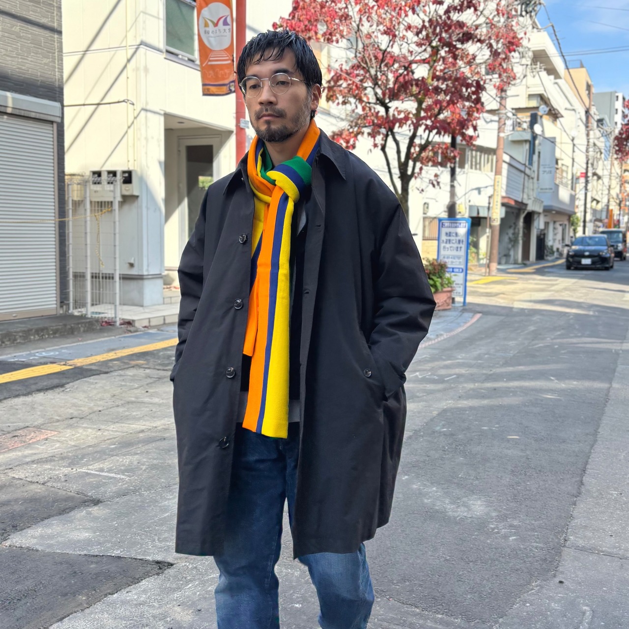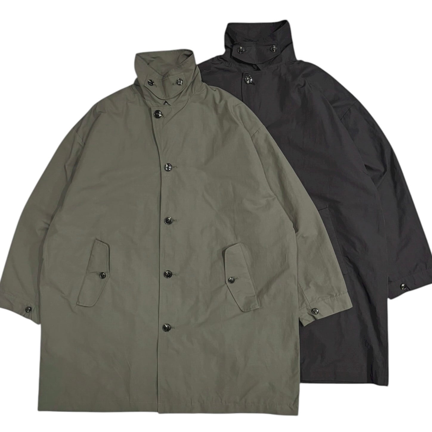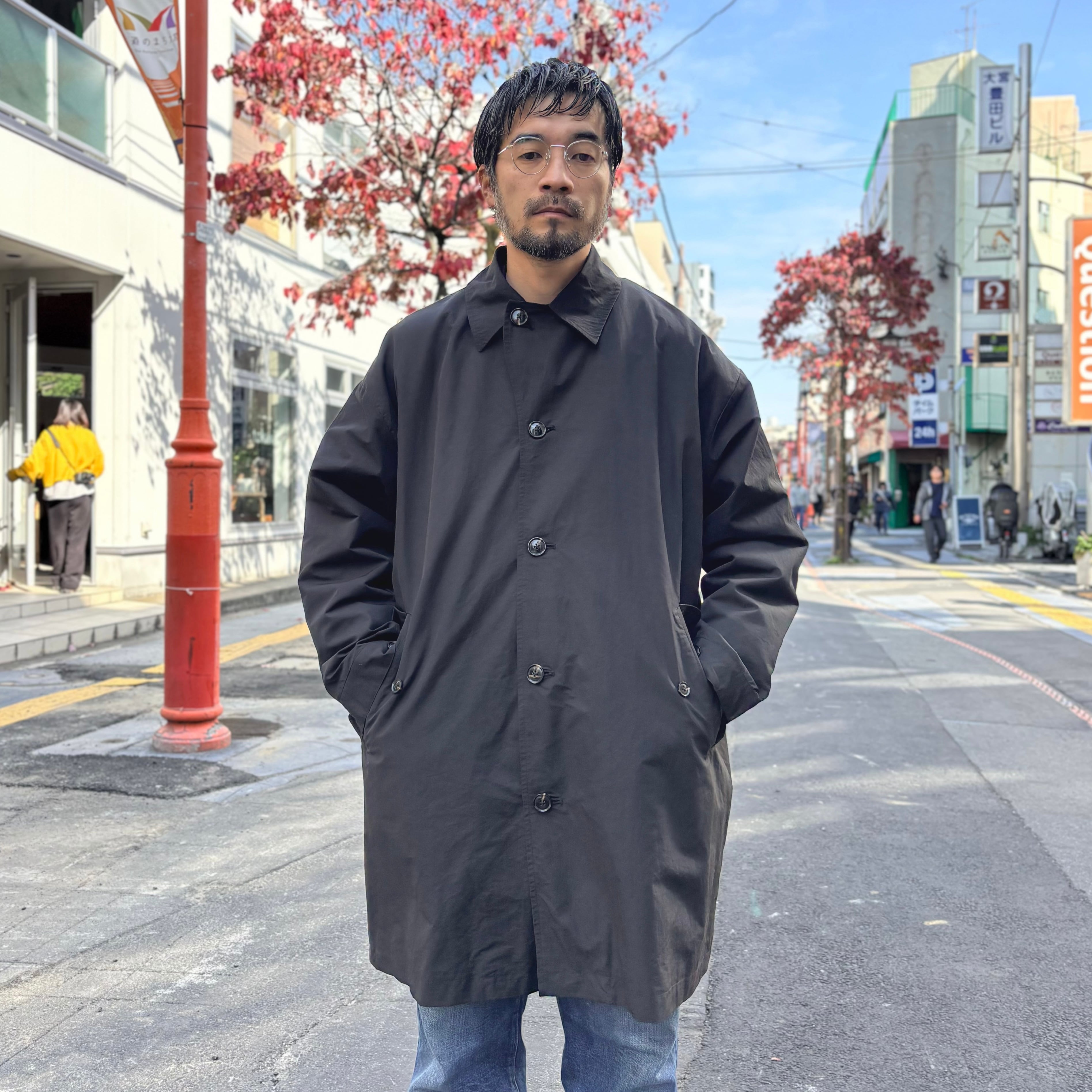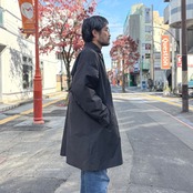 通常のステンカラーコートよりも、ゆったりとした身幅、袖周り、裾巾で作られており、袖のダーツや、キュッと締められる袖口のアジャスターなど、ミリタリーウェアのディテールがカジュアルな印象を加えています。