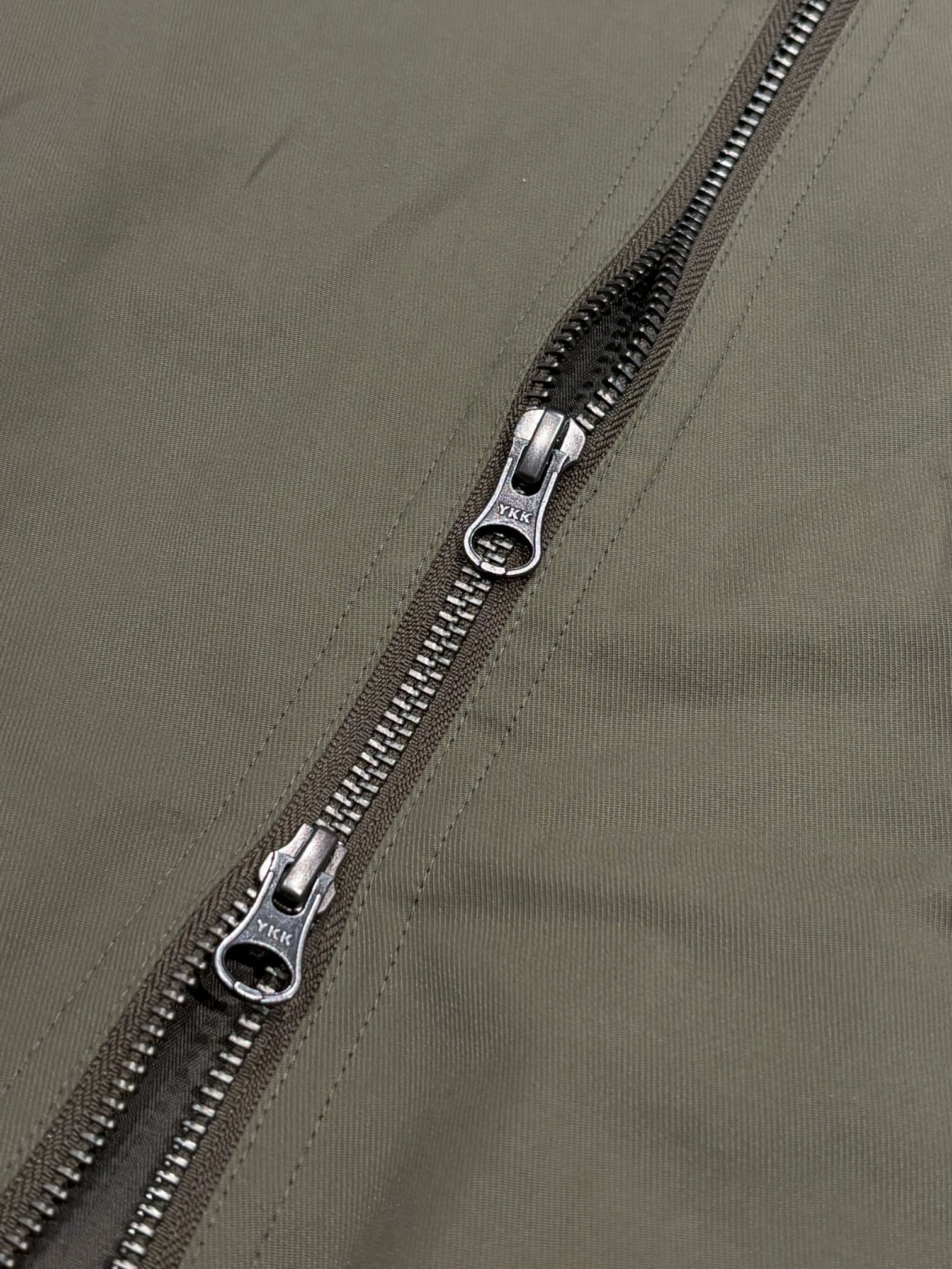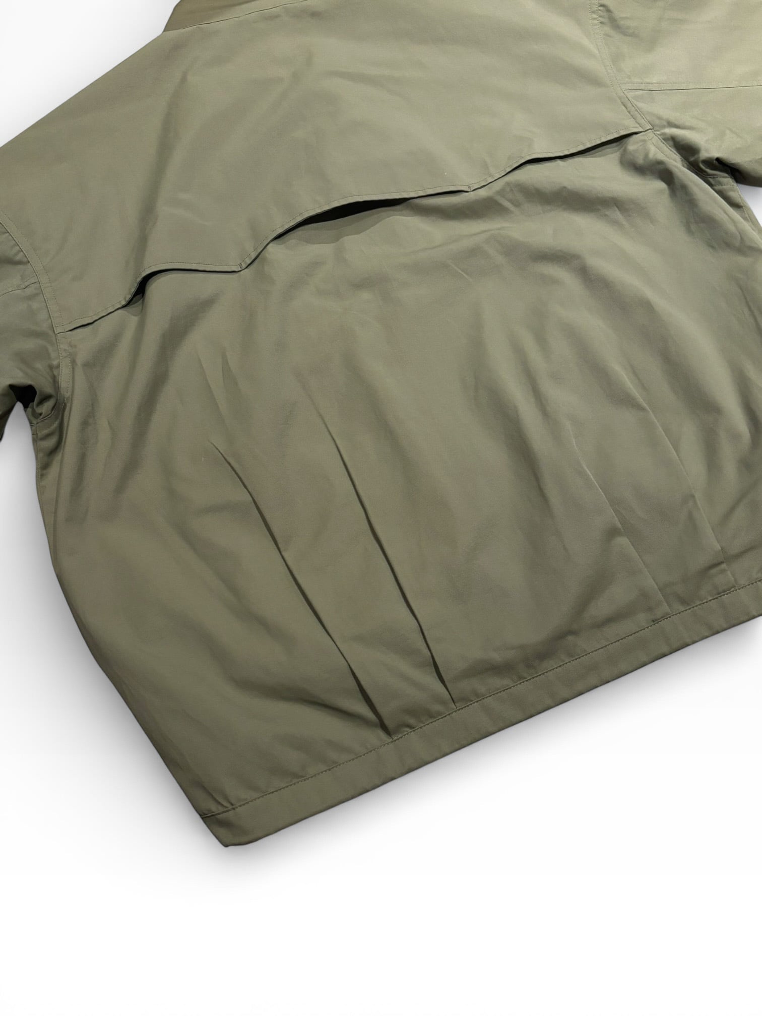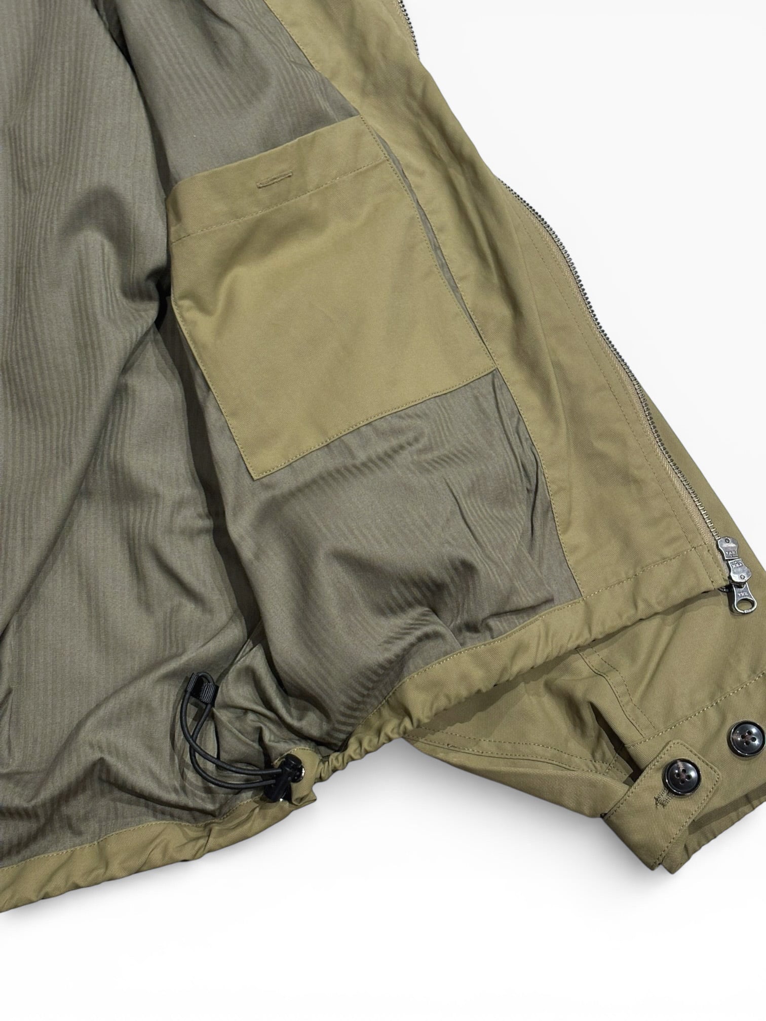 生地には高密度に織り上げられたコットン/ナイロンツイルを採用。若干の光沢感と自然なシワ感でコーディネートに馴染みやすい生地です。
