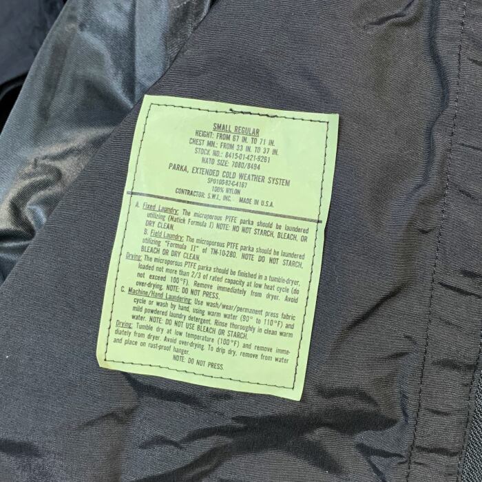 米軍ECWCS(拡張式寒冷地被服システム)の第2世代(GEN2)レイヤー4に位置するコールドウェザーパーカーを、実際に米軍に納入しているメーカーのS.W.I INC社が当時民生品として同等のスペックにてリプロダクトしたもののデッドストック品です。