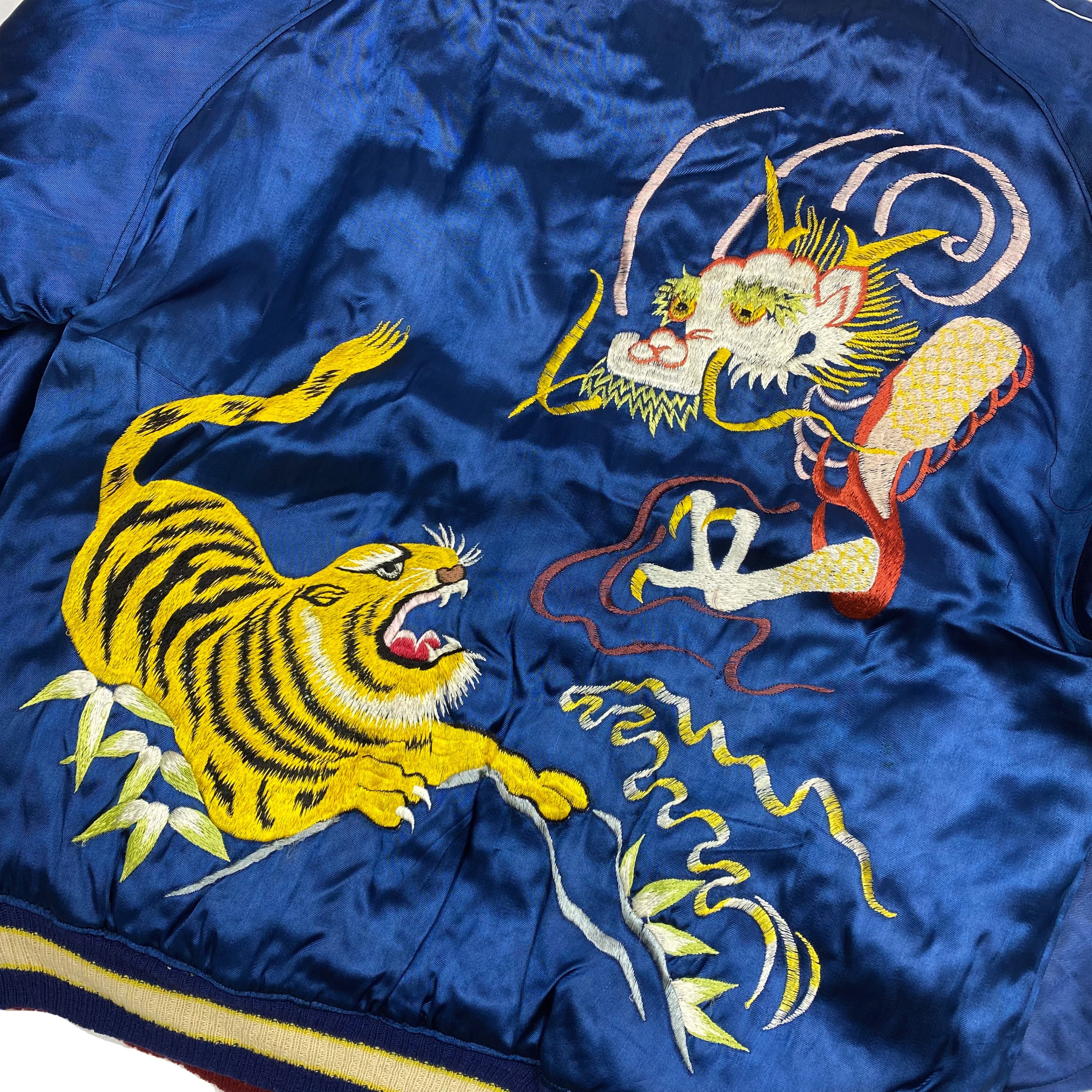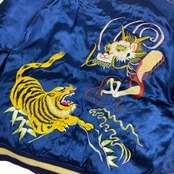 両面サテンA面はブルーで、両胸に龍、バックに龍と虎の刺繍が施されています。