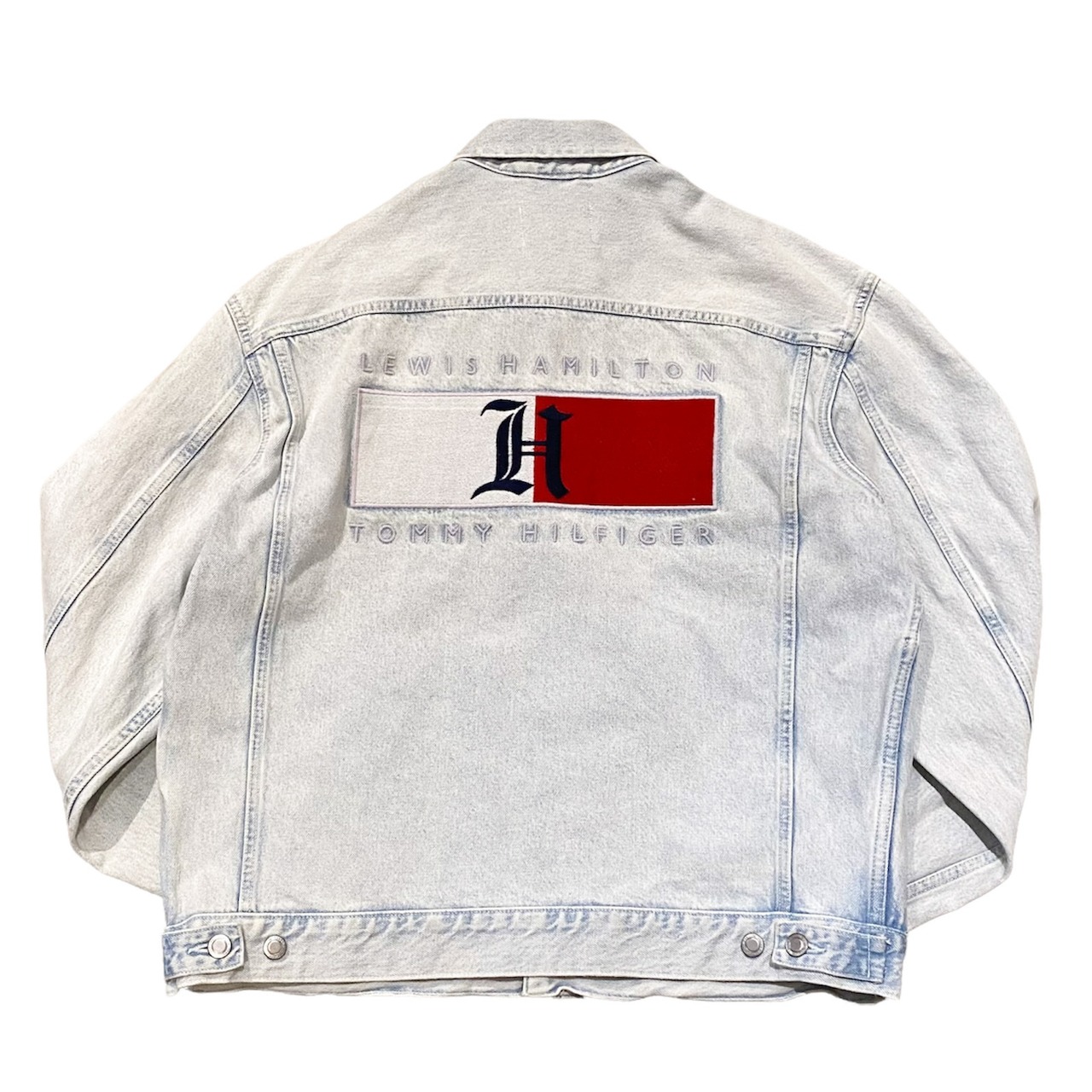 フロントは、デニムジャケット定番のデザインで、バックにはF1初の黒人ドライバー、【ルイス・ハミルトン】のHの刺繍とハミルトン×トミーのブランドネームが刺繍で贅沢に施されています。