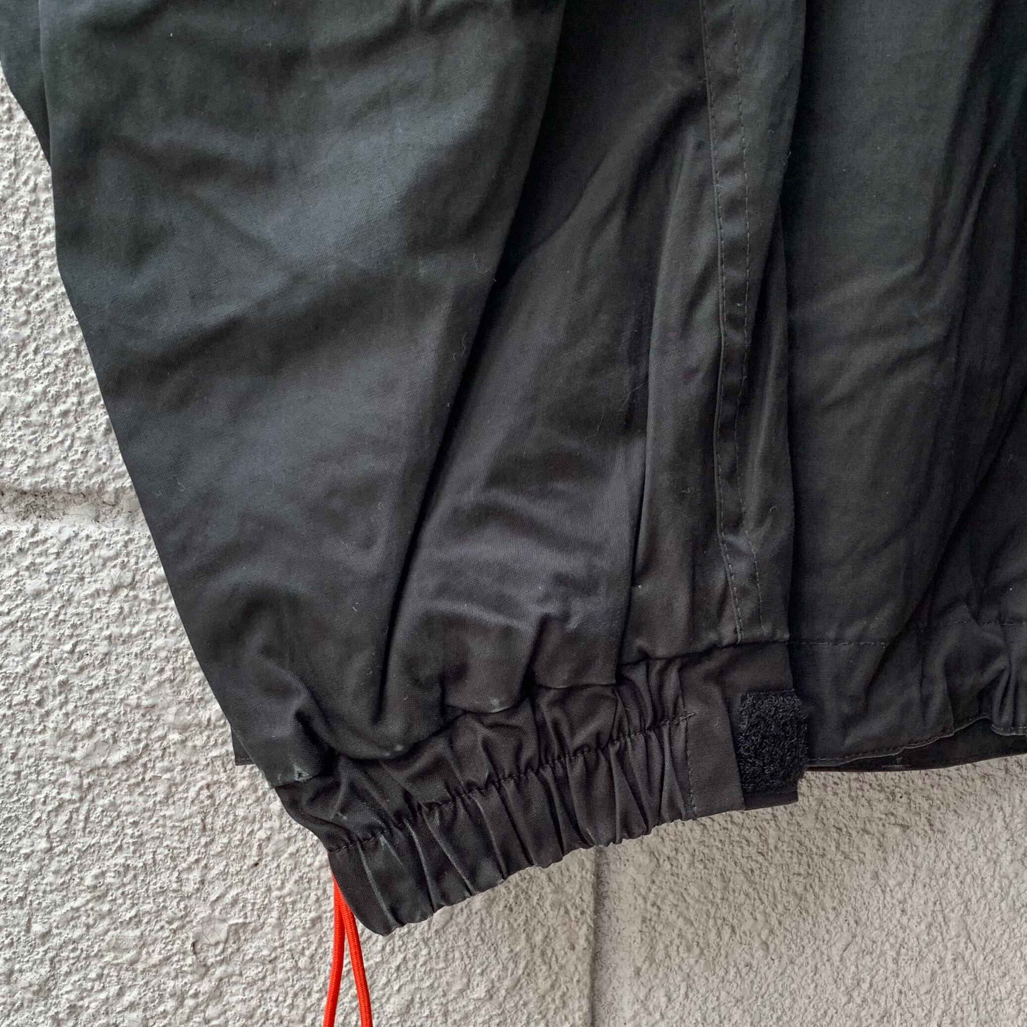 コットン素材のブラックのボディに、フードの紐と袖部分のオレンジや、裏地とワッペンのブルーが良いアクセントになっています。