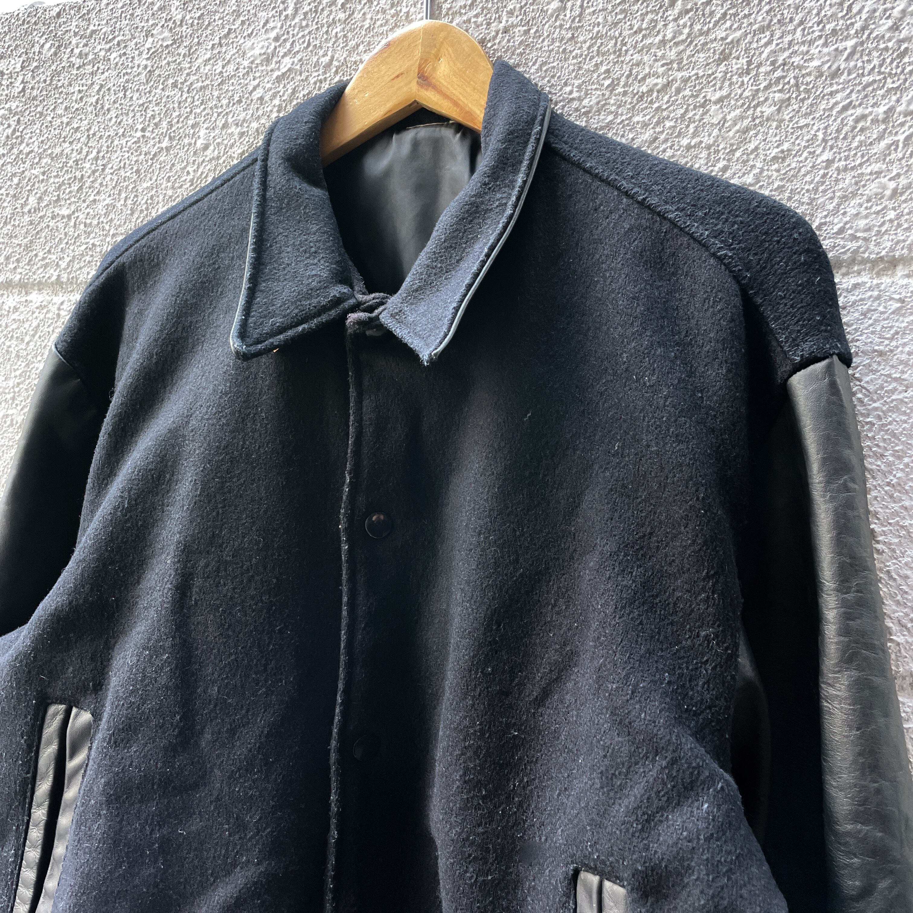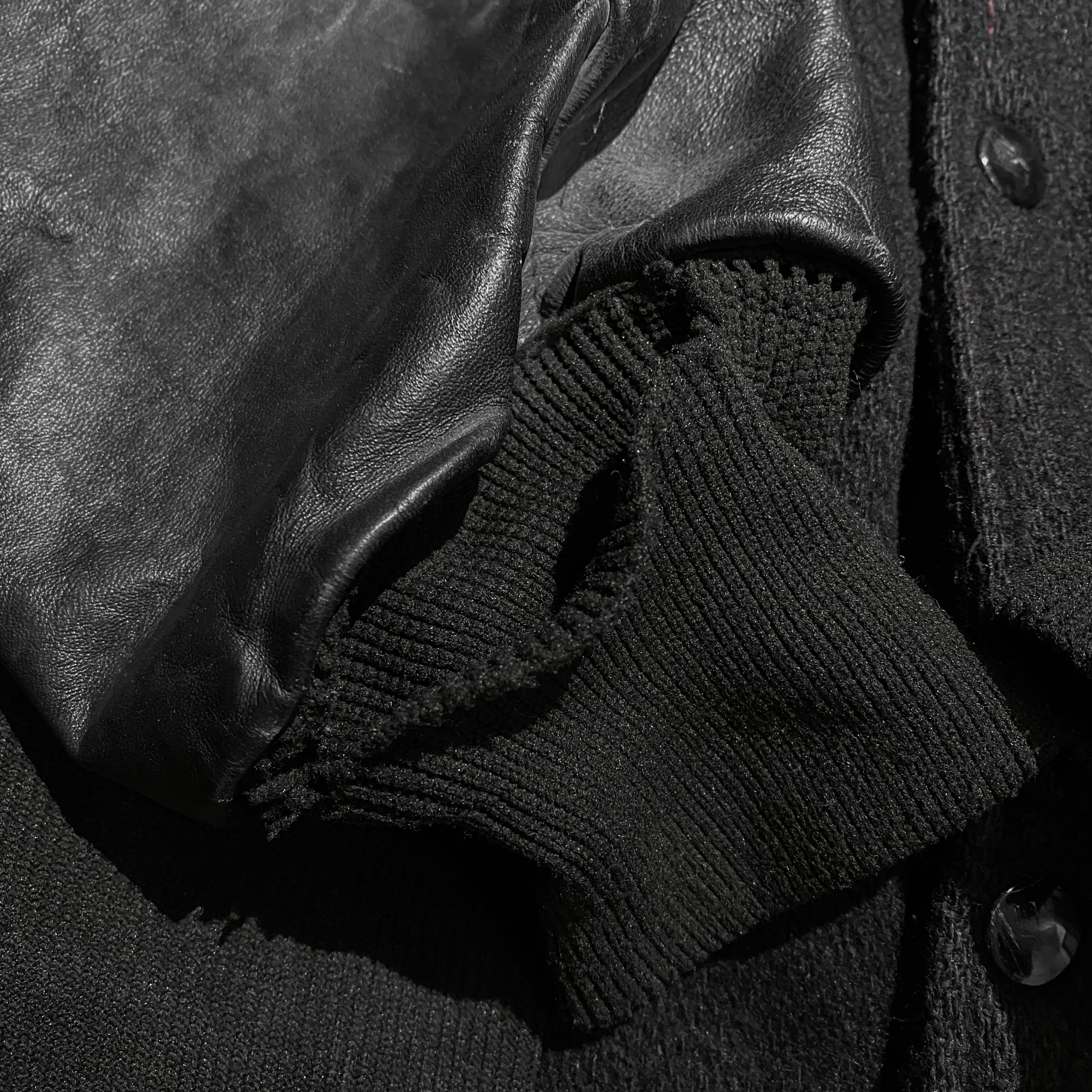 ボディはオールブラックのスタジャンで、袖、襟裏、ポケット口はレザーに切り替わっています。