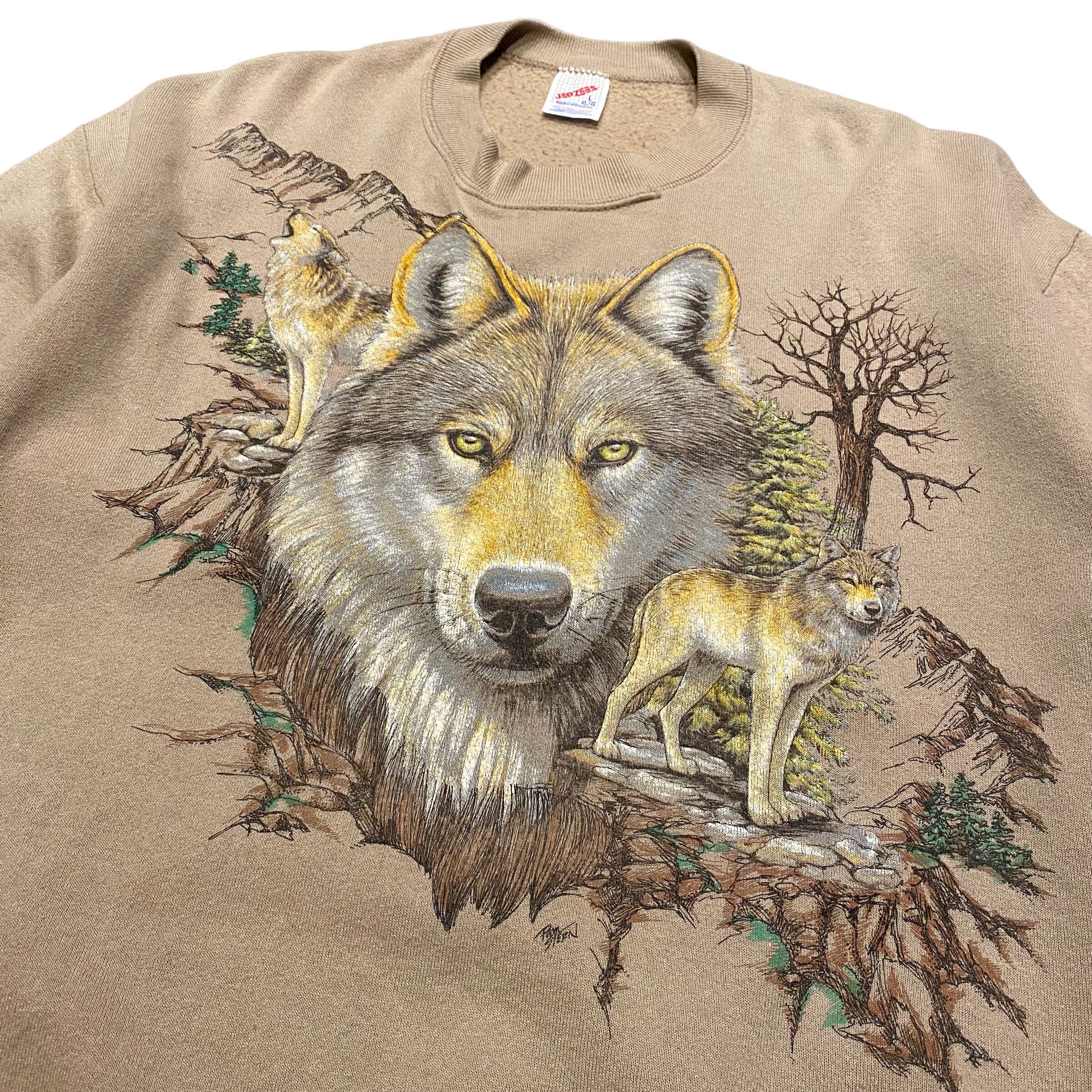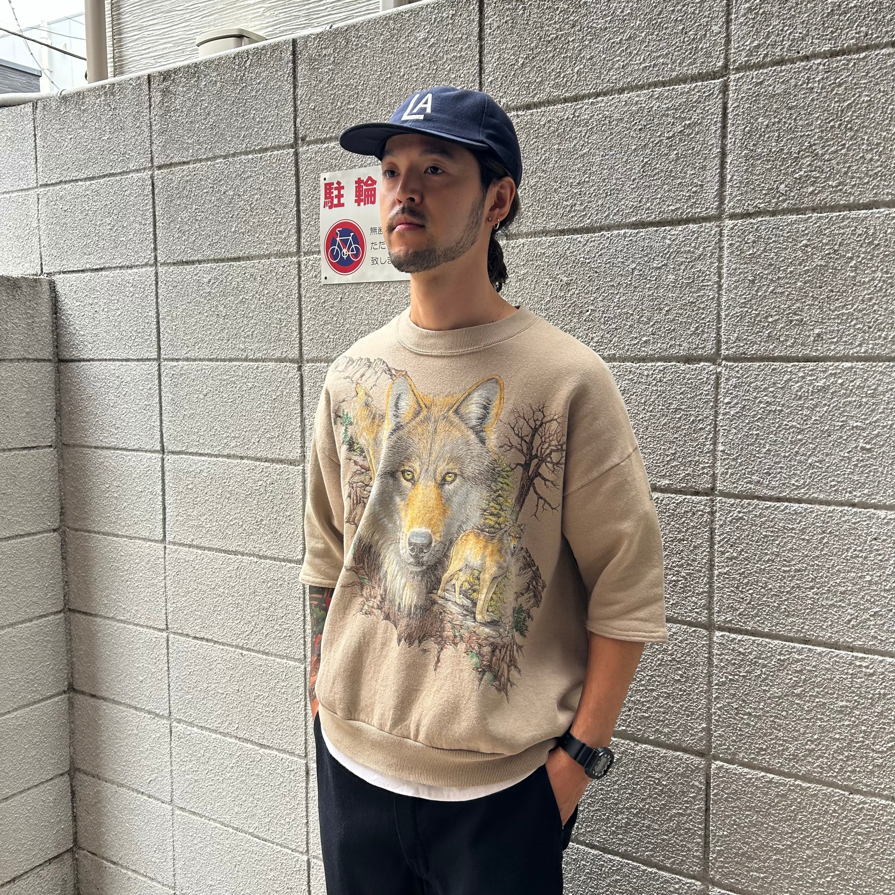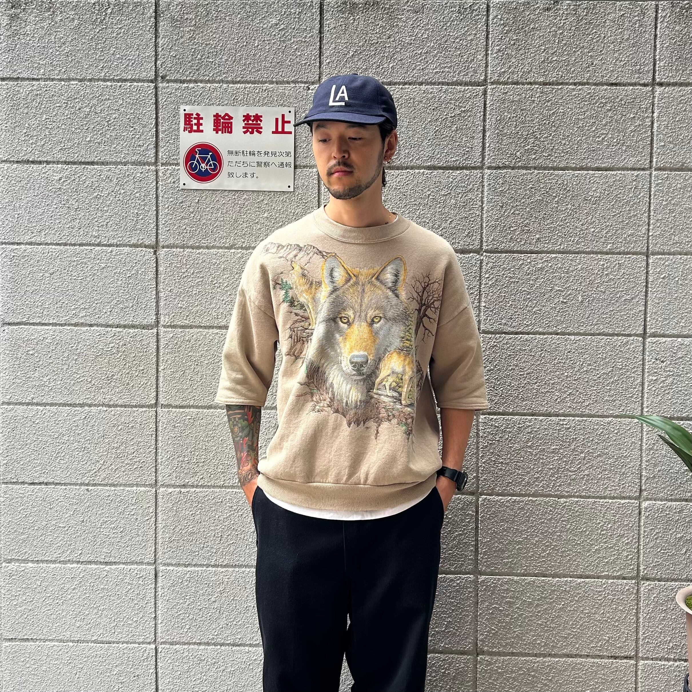 90's USA製 JERZEES Animal Print Cutoff S/S Sweat L ジャージーズ 半袖スウェット 動物 オオカミ プリント 古着 ヴィンテージ