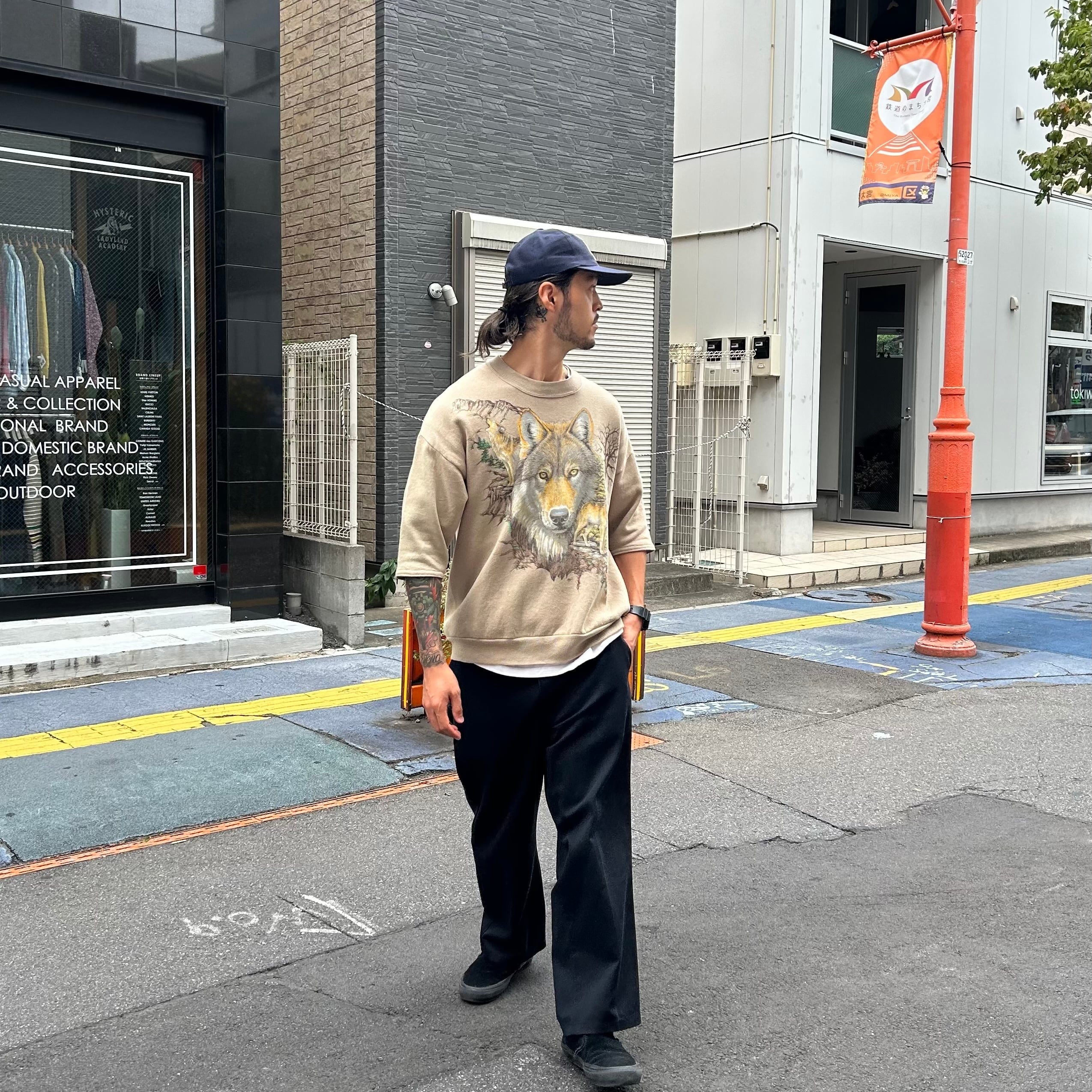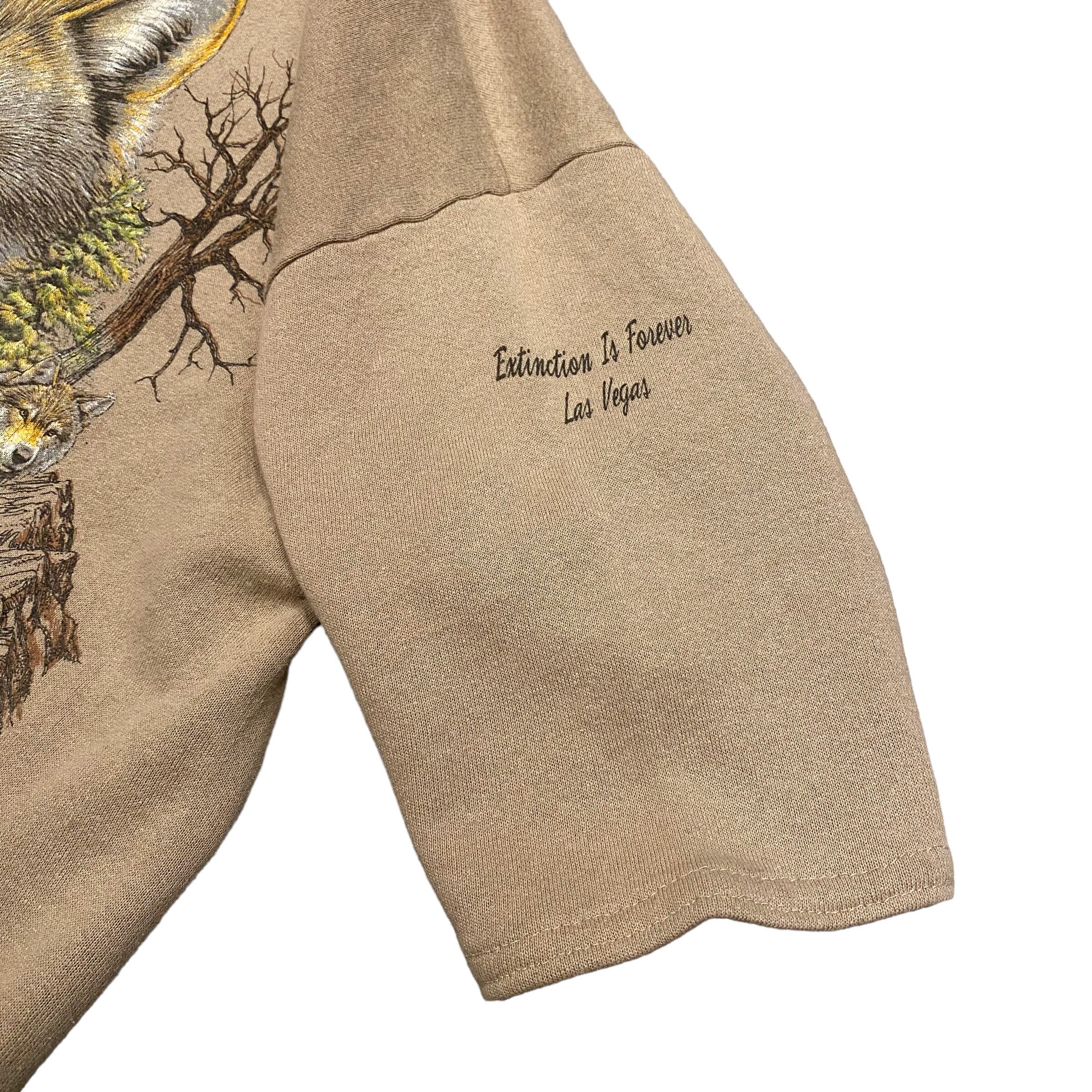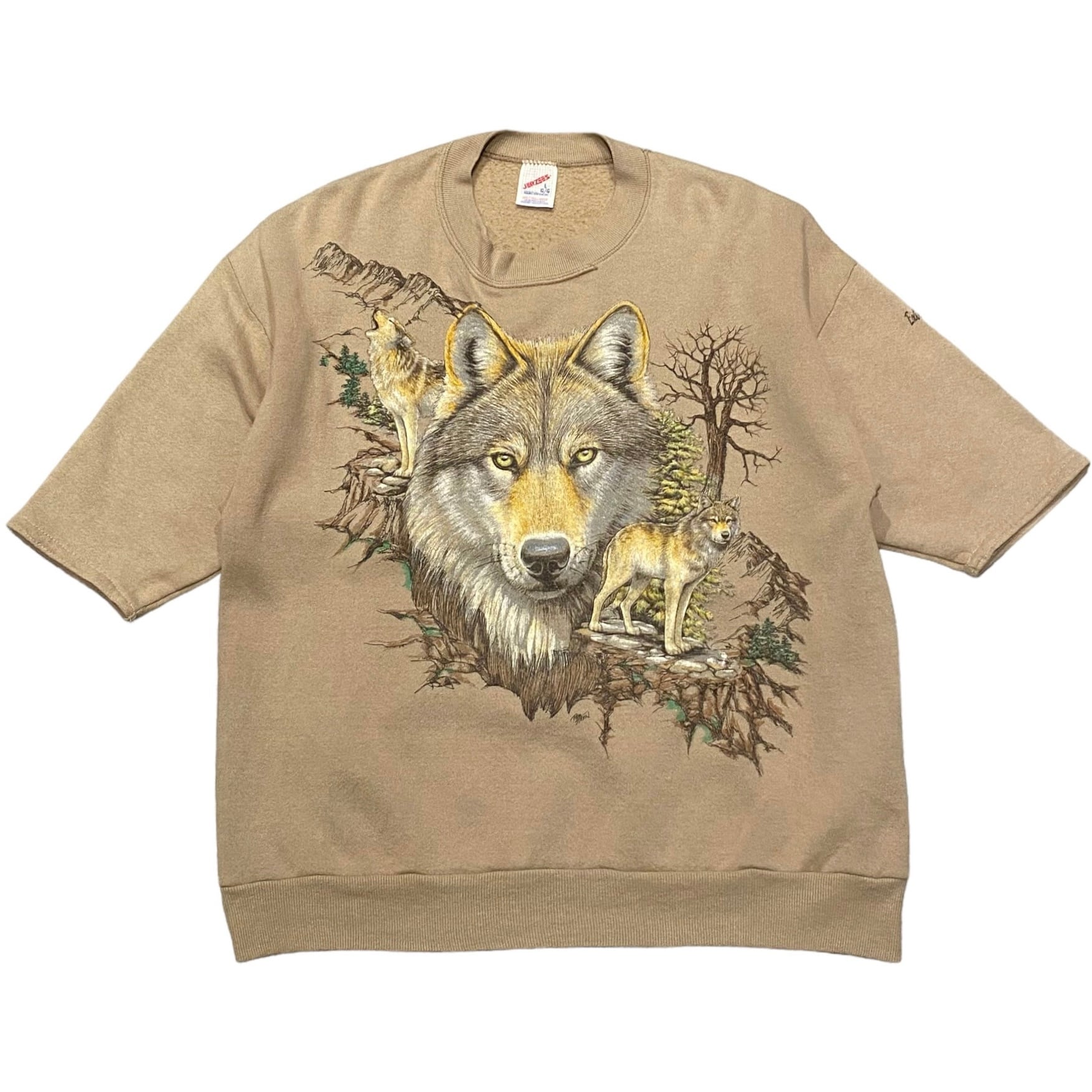 90's USA製 JERZEES Animal Print Cutoff S/S Sweat L ジャージーズ 半袖スウェット 動物 オオカミ プリント 古着 ヴィンテージ