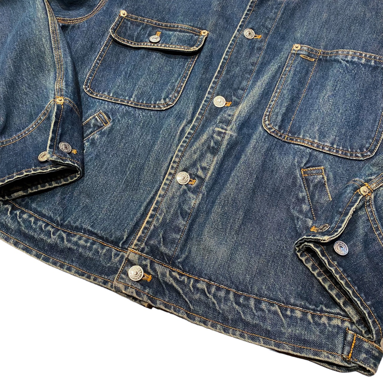 濃さの残るデニム生地に、襟のコーデュロイや背面裾のレザーパッチのベージュが効いています。