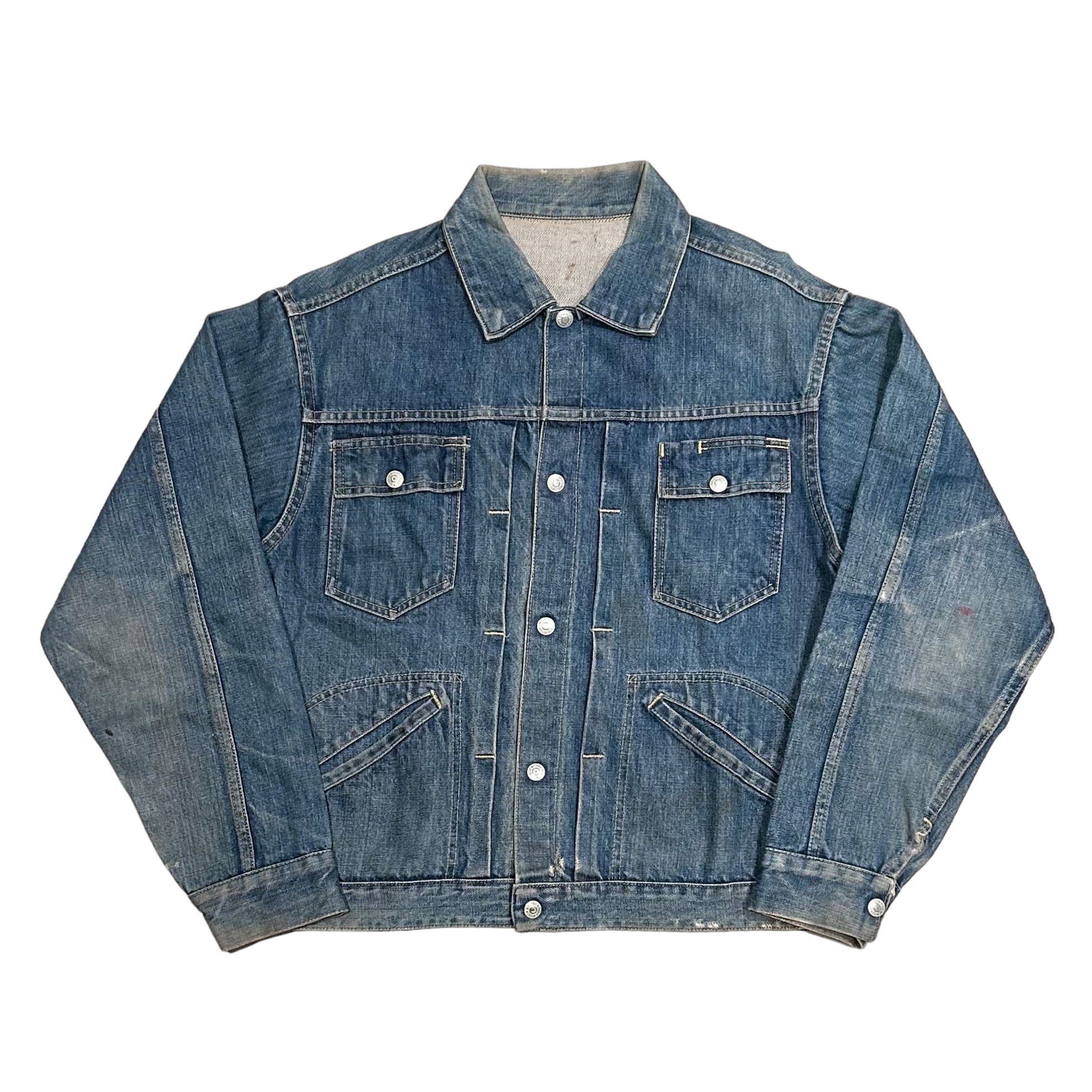 フロント、袖、裏地、背面など所々にシミや汚れ