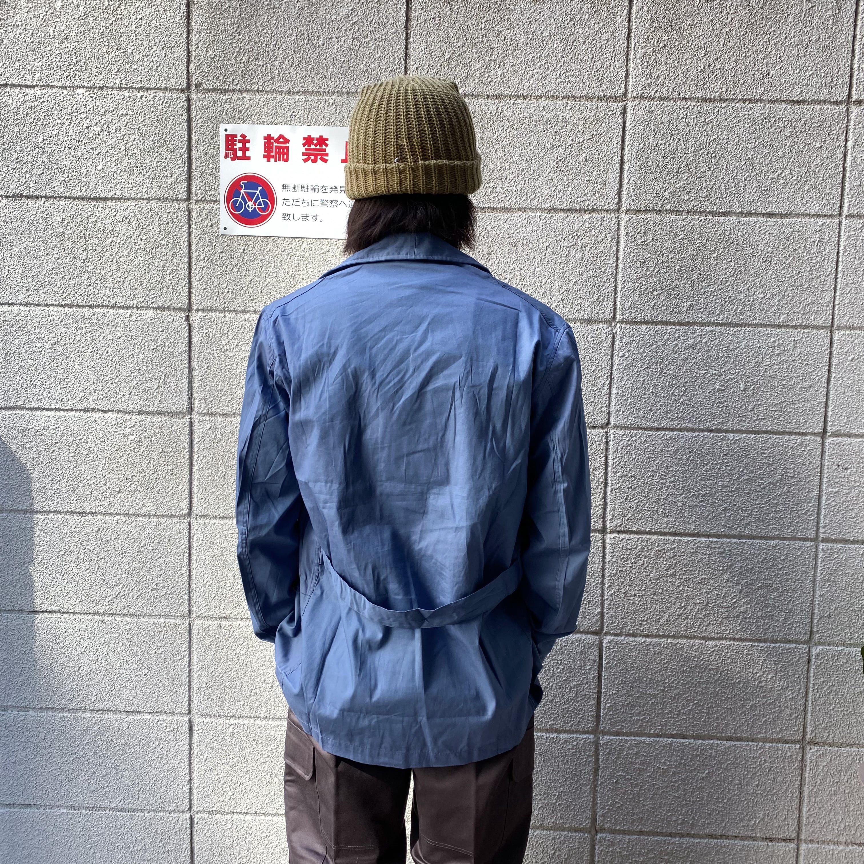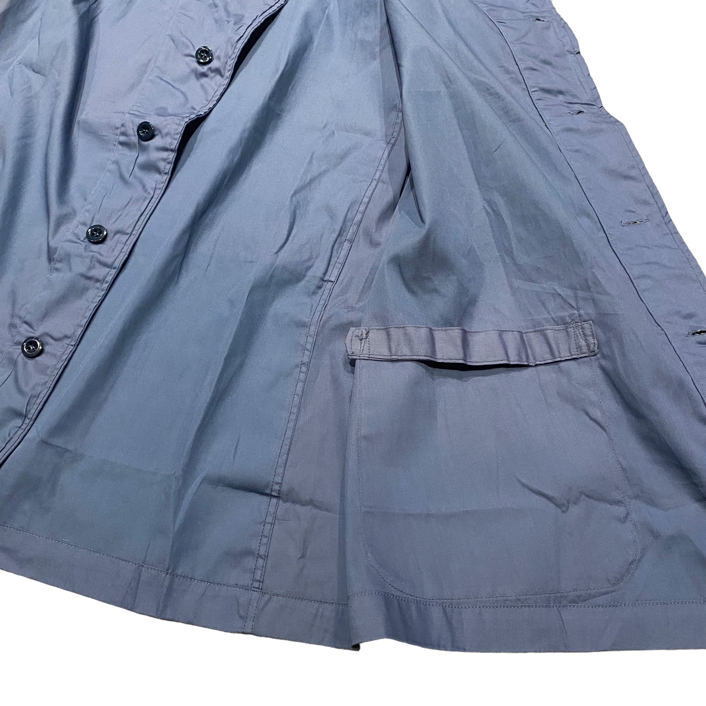 生地はシャツのように薄手のコットン地で、ネイビーとブルーの中間のような色味。
