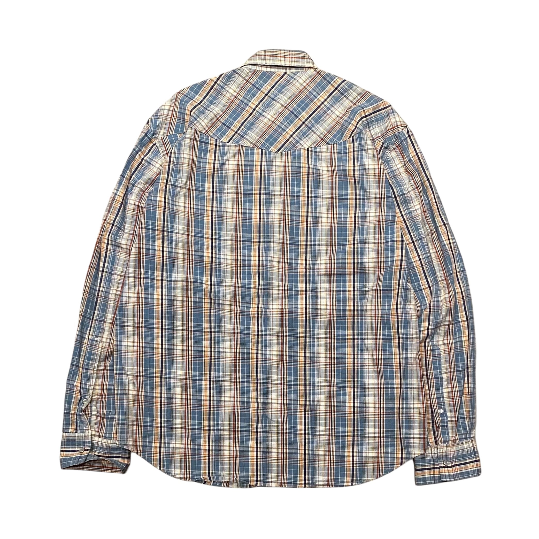 肩部分のヨーク、スナップ式のパールボタンなどウエスタンシャツのディテールが施されています。