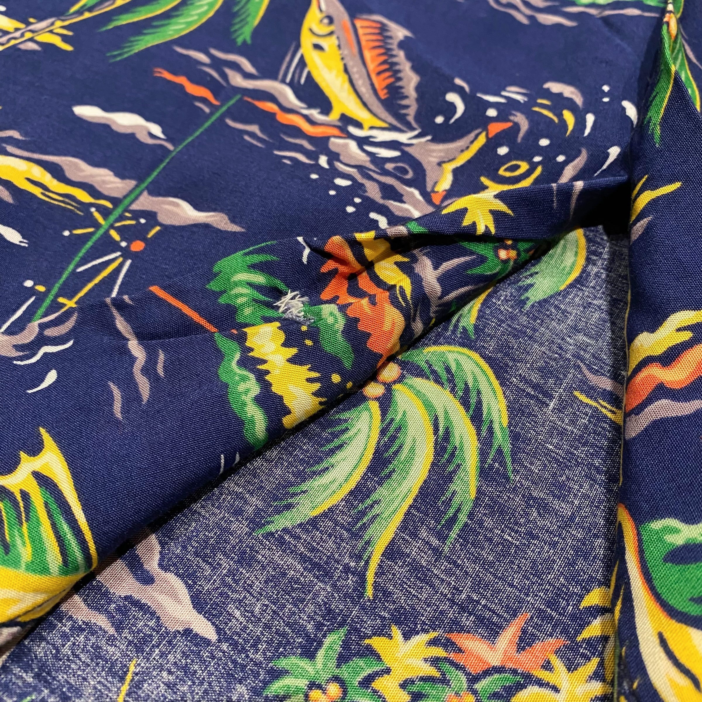 ハワイアンシャツの中でもポップなデザインと配色で着やすいと思います。