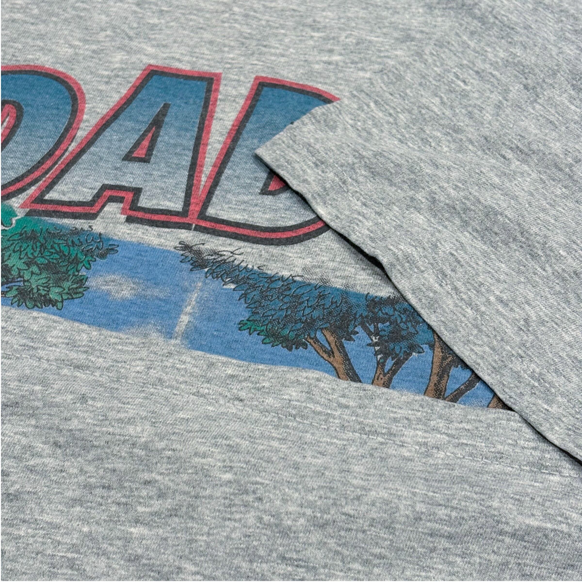 カラーはグレーで、フロントにユーモアある古着らしいプリントが施されています。