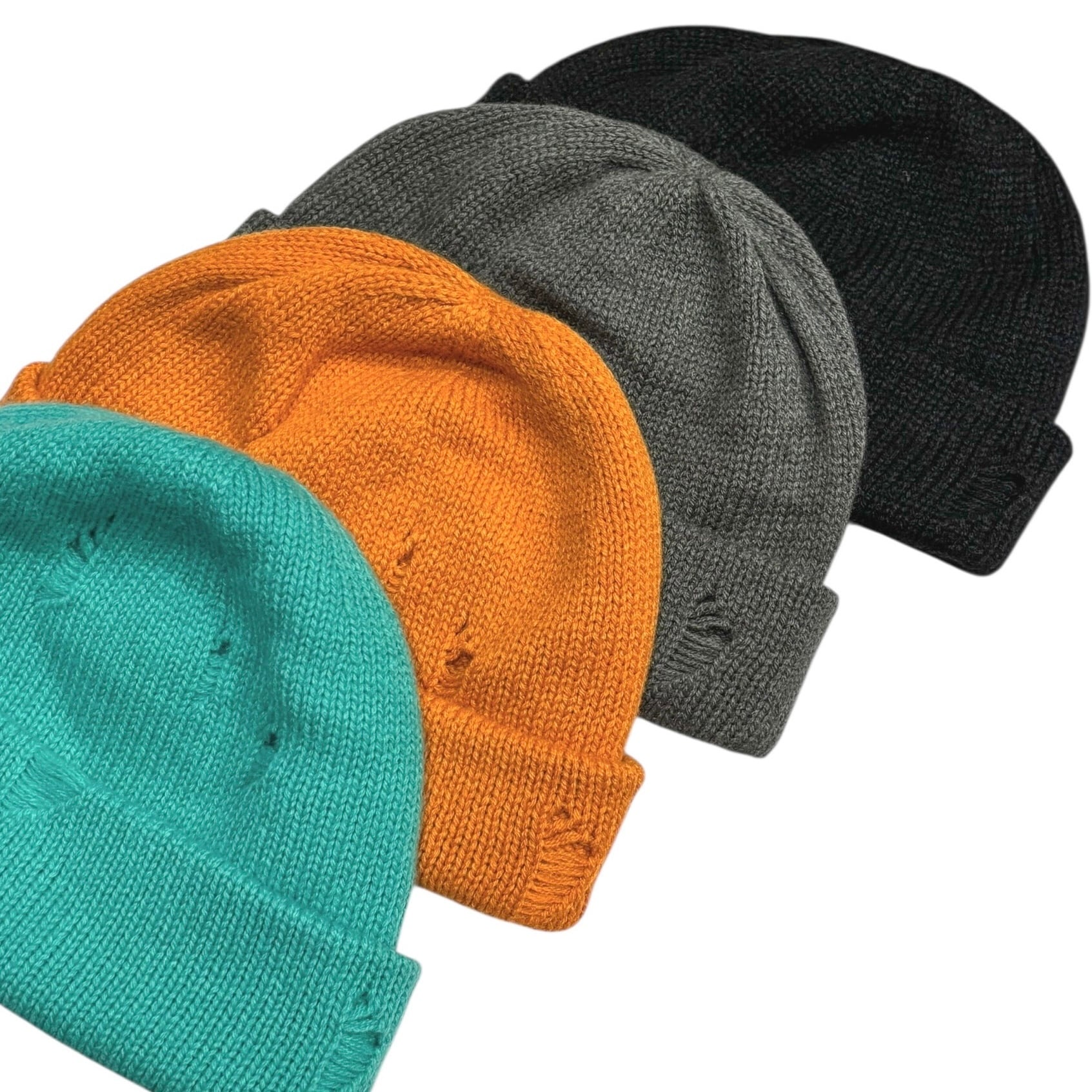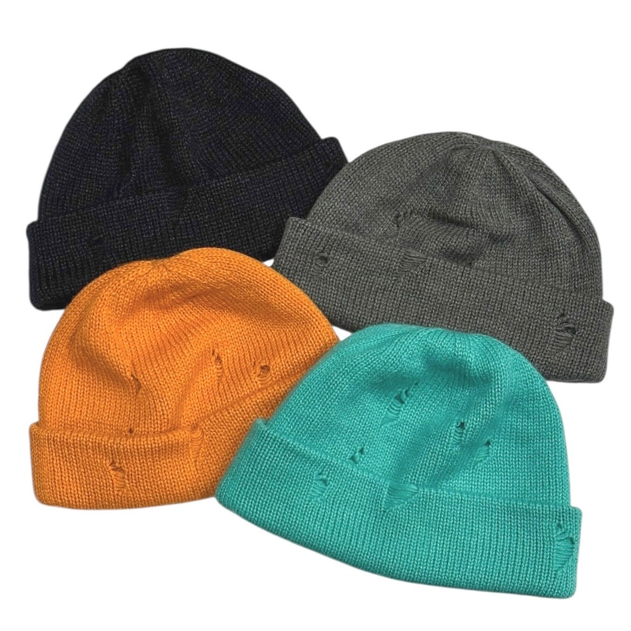 ウェアでは見かけますが、ニット帽にダメージ加工が施された新鮮なデザイン。