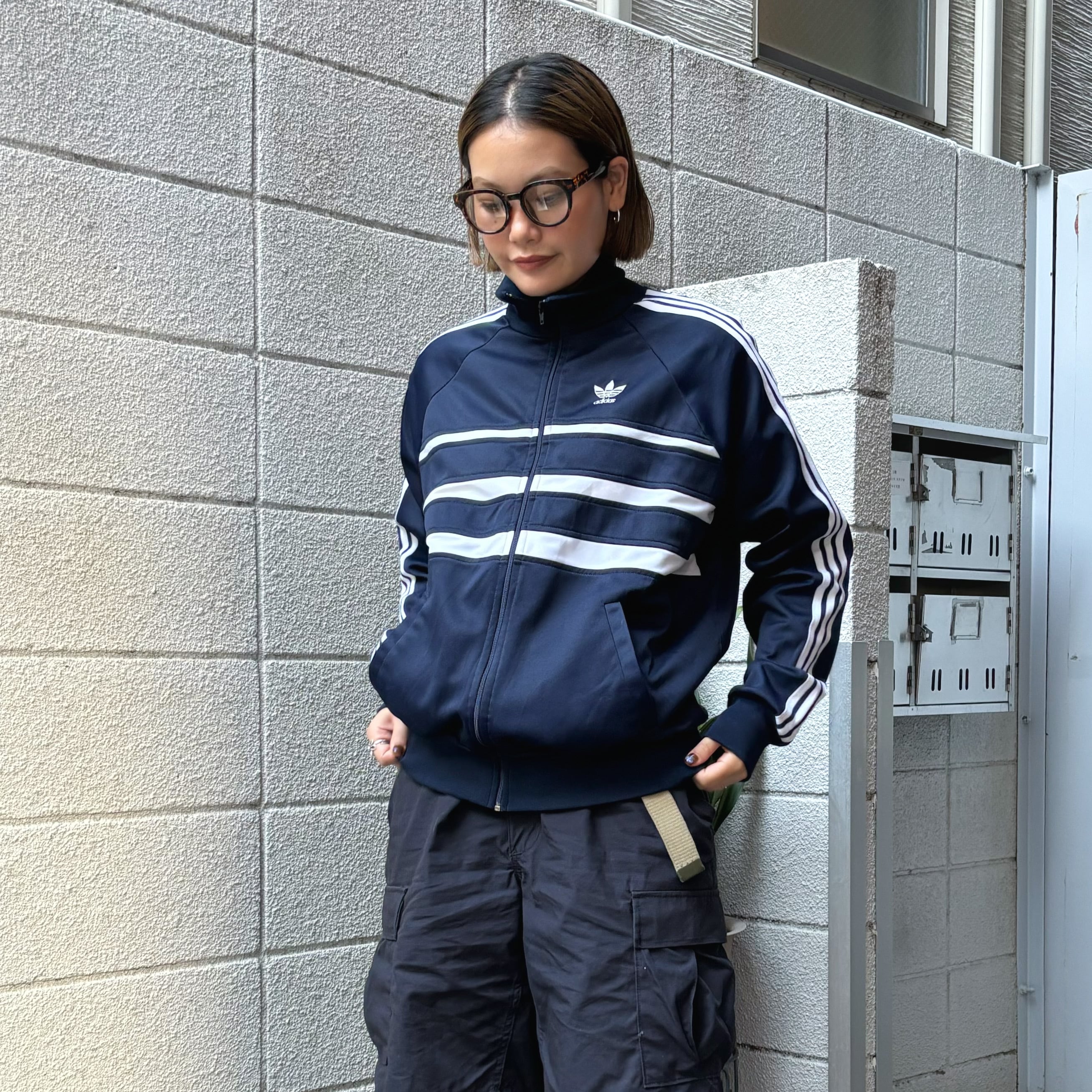 アディダスのトラックジャケットの中でもインにアウトに使いまわしやすい配色とデザインのです。