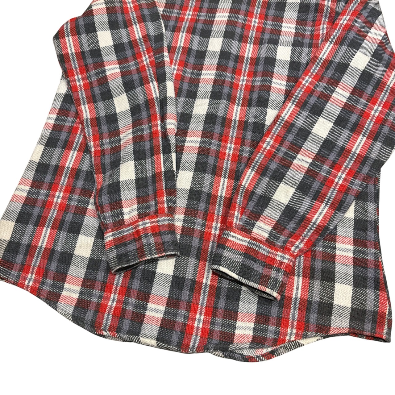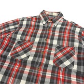 レッド×ブラック×グレー×ホワイトのブロックチェックで、ポケットのみ柄の向きが斜めに施されています。