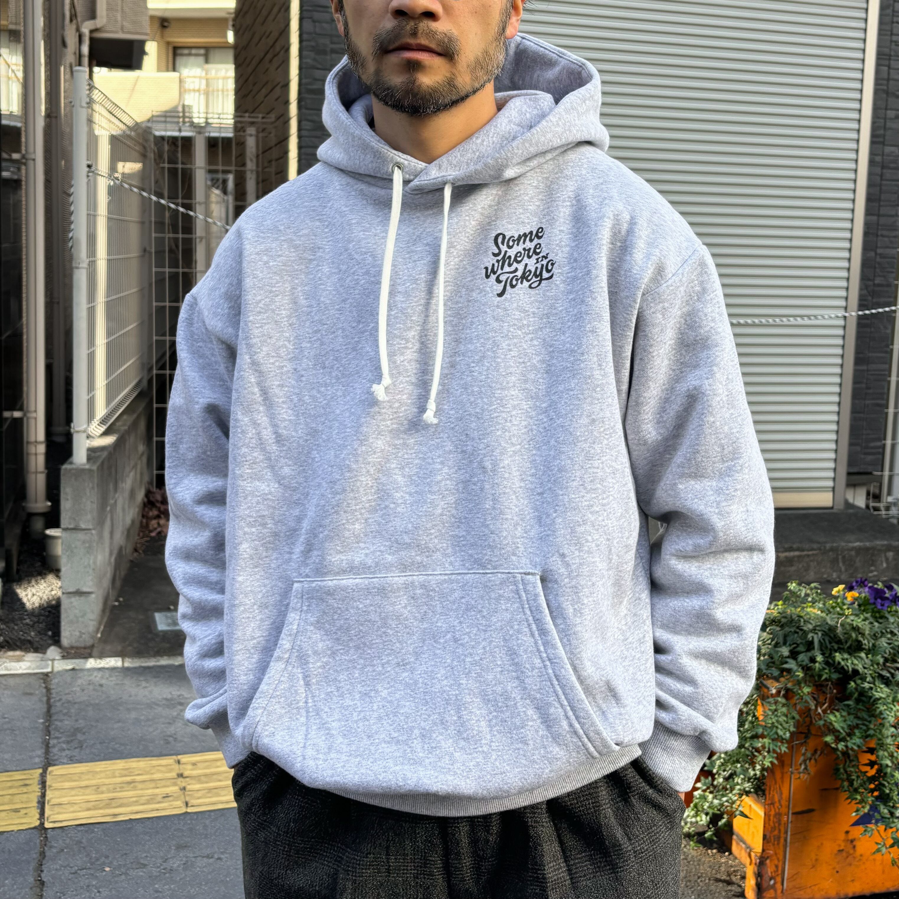 Somewhere in Tokyoオリジナルファブリック”9.3oz Sweat”に、Shinya Nakahara氏によるロゴをプリントしたスウェットパーカー。